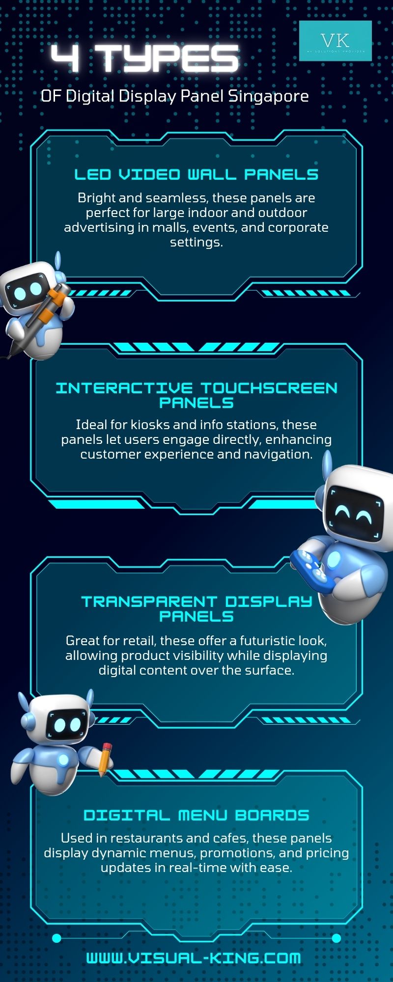 Explore four key digital display panel Singapore options: LED video walls for bold visuals, interactive touchscreens for user engagement, digital menu boards for real-time updates, and transparent panels for a modern retail edge. Each type serves a unique purpose across industries like retail, F&B, and events—helping businesses attract, inform, and impress customers with eye-catching, efficient digital communication tools.