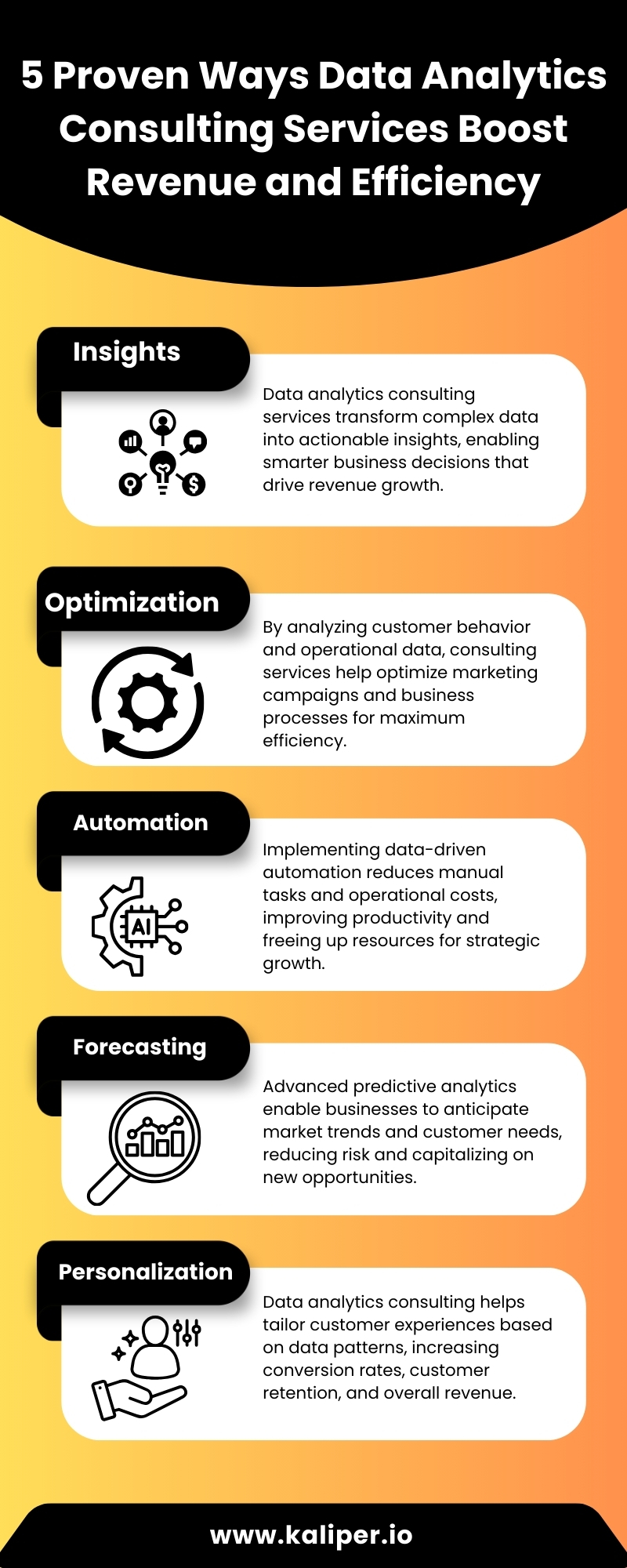 Enterprise leaders can no longer ignore the power of data. Discover 5 proven ways Data Analytics Consulting Services boost revenue and efficiency by streamlining operations, enhancing forecasting accuracy, and improving customer targeting.✅ Ready to elevate your business? Talk to our data experts now and get a personalized strategy.