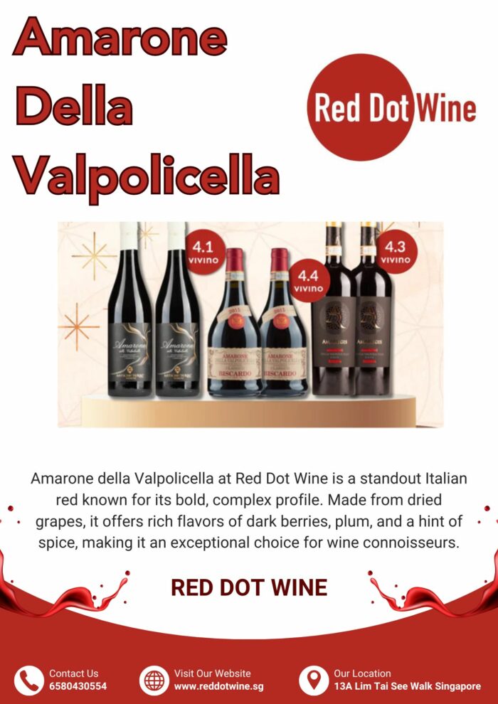 Experience the rich, bold flavors of Amarone Della Valpolicella at Red Dot Wine. This full-bodied Italian red boasts intense notes of dried fruit, spice, and velvety tannins. Sourced from top European vineyards, our selection offers premium quality at unbeatable prices. Enjoy exclusive discounts and doorstep delivery in Singapore. Order now and elevate your wine collection!