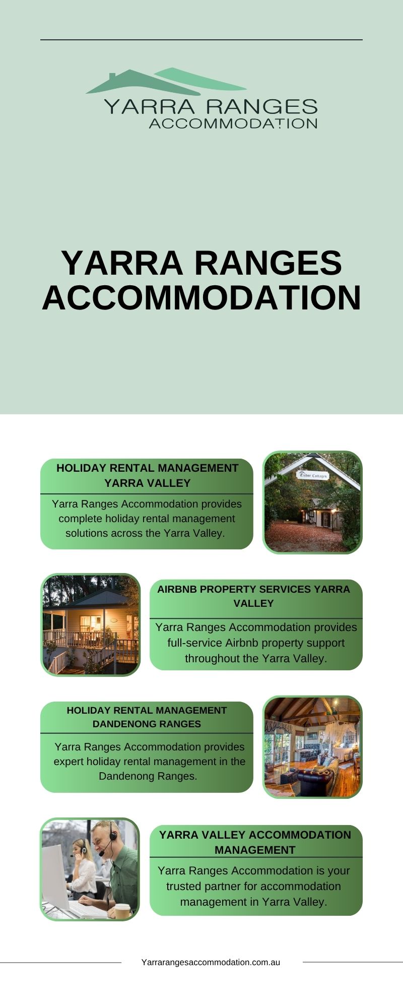 Yarra Ranges Accommodation provides full-service Airbnb property support throughout the Yarra Valley. From pricing and guest messaging to professional cleaning and repairs, we take care of every detail. Our experienced team works to maximise your income and guest satisfaction. Partner with us to run a smooth and successful Airbnb in this high-demand region.