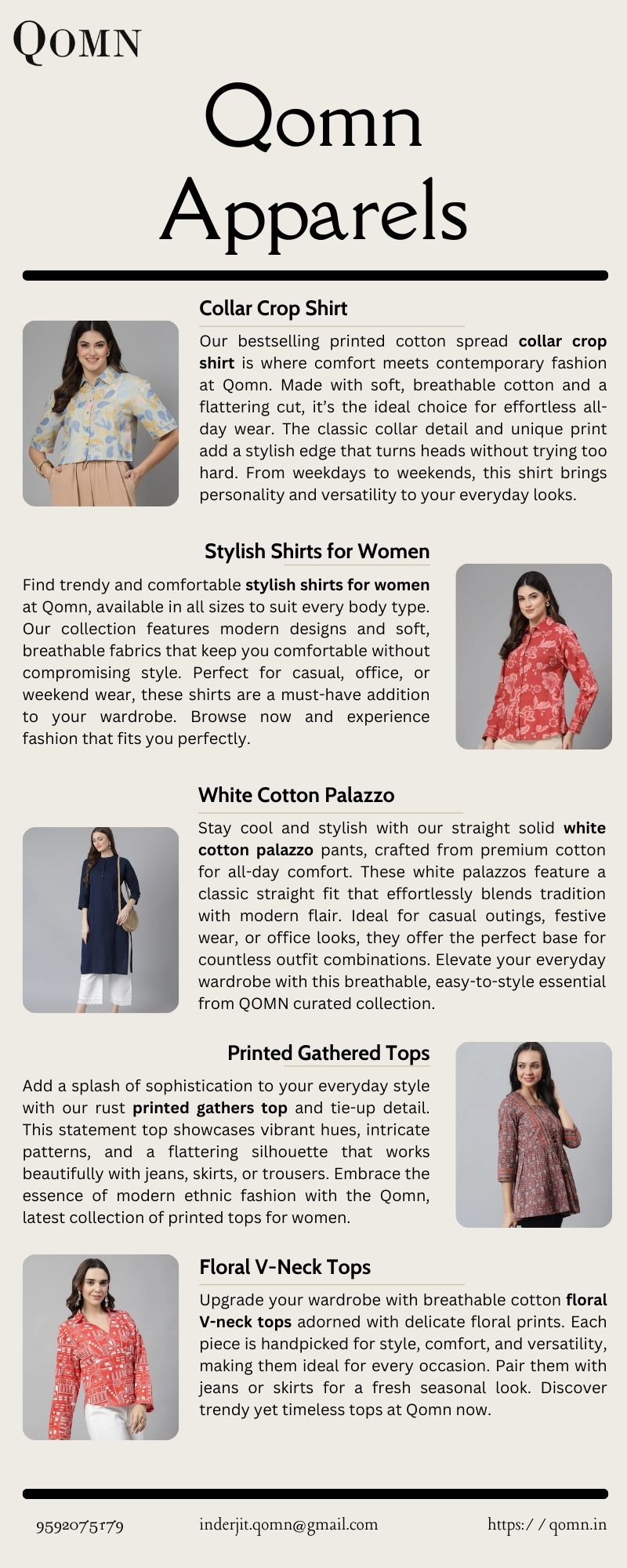 Our bestselling printed cotton spread collar crop shirt is where comfort meets contemporary fashion at Qomn. Made with soft, breathable cotton and a flattering cut, it’s the ideal choice for effortless all-day wear. The classic collar detail and unique print add a stylish edge that turns heads without trying too hard. From weekdays to weekends, this shirt brings personality and versatility to your everyday looks.