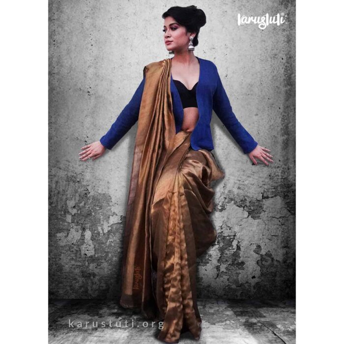 80 cnt fine linen with all over twisted tissue weaving , 3ply twisted tissue weaving with linen gives you nice fall , perfect sheen and ultimate festive wear. this saree take 7 days to complete.AZO and PCP free color. starch not require.