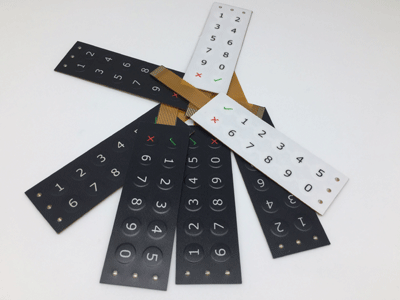 Graphic Overlay – PET/PC is usually the overlay material of choice due to its fantastic chemical resistance and flex property. Komkey offers membrane switch customized design services such as digital printing, screen-printing, or apply both methods to ensure you get the right colors, textures and finish your membrane switch design requirements.