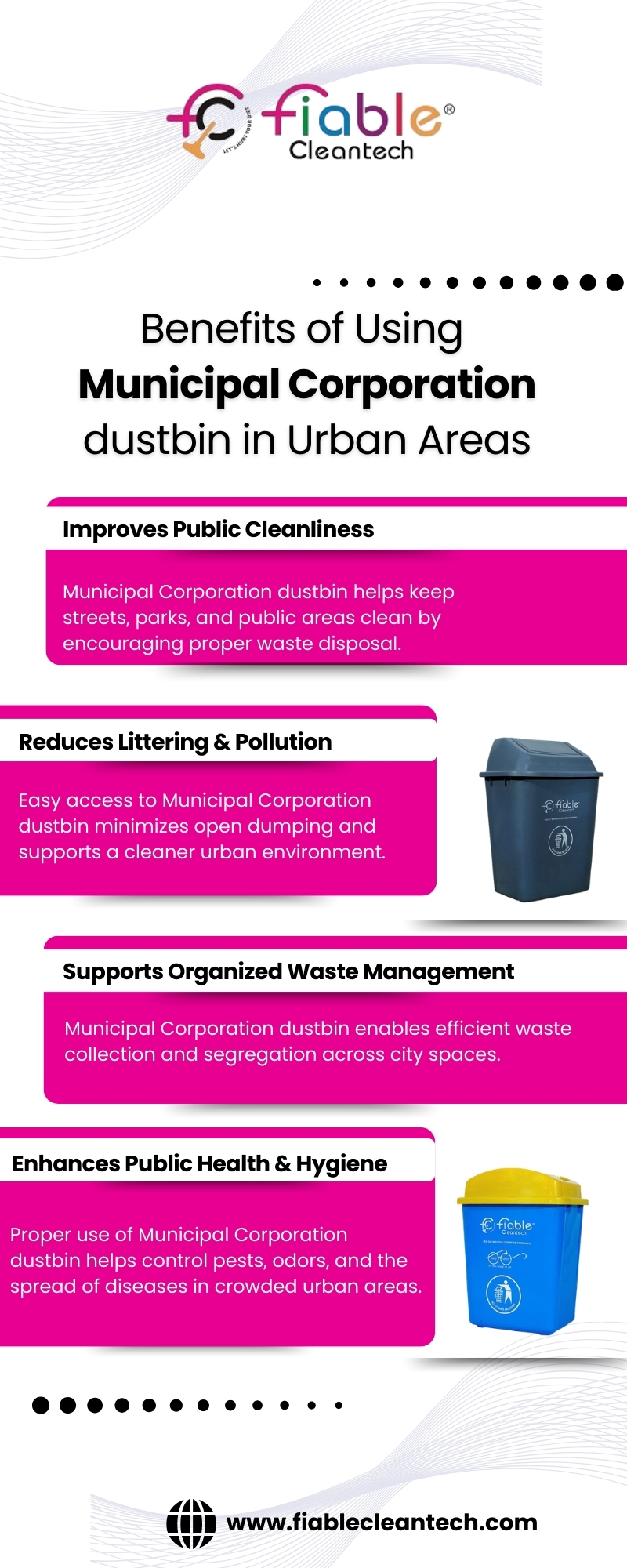 Upgrade public spaces with a modern and functional Municipal Corporation dustbin from Fiable Cleantech Limited. Its user-friendly design enhances public participation in waste disposal while maintaining aesthetic appeal in urban areas. Perfect for smart cities, townships, and redevelopment projects focused on cleanliness and organization.