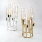 An eight-stem taper candle holder on a round metal base blends artistic design with everyday function. Its balanced form and elegant metal finish add modern sophistication. Perfect for special occasions or daily décor, it creates warm light, refined style, and an inviting ambiance in any space, home or event settings.