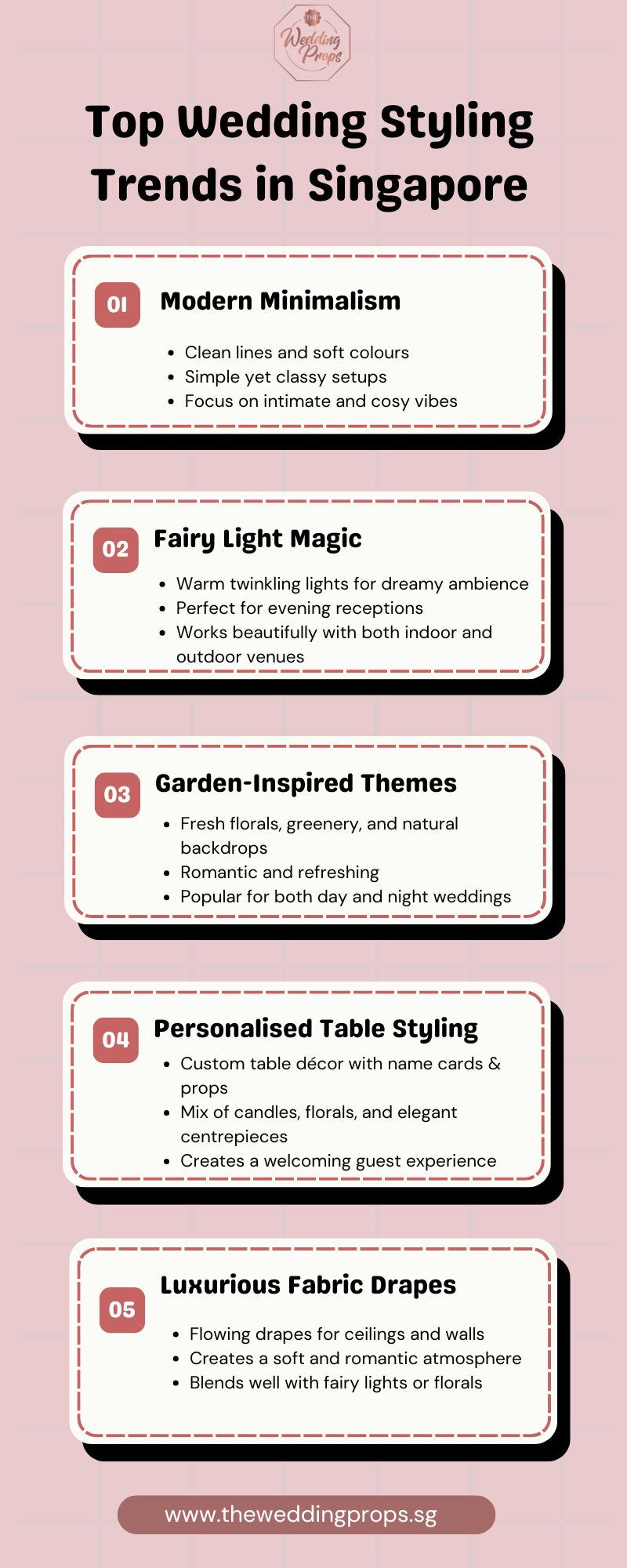 Every couple wants a wedding that feels special and reflects their story. As a trusted Wedding Stylist Singapore, The Wedding Props brings fresh ideas and creative touches to make each celebration unique. From modern minimal themes to romantic fairy lights and floral designs, we keep styling simple yet elegant. We focus on details that make your day memorable—beautiful backdrops, thoughtful table setups, and décor that matches your personality.