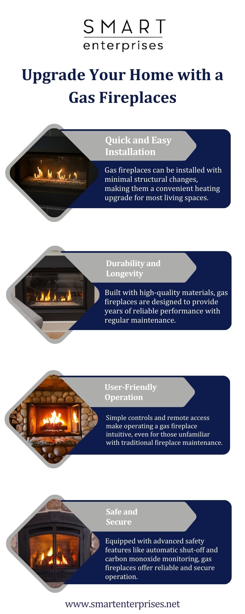 Upgrade your home with a stylish and efficient gas fireplace from Smart Enterprises. Enjoy warmth, ambiance, and energy savings with our premium selection. Elevate your living space with hassle-free installation and modern designs. Experience comfort and elegance today!